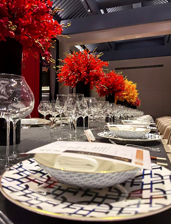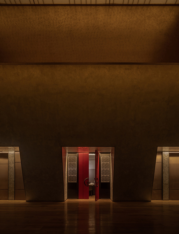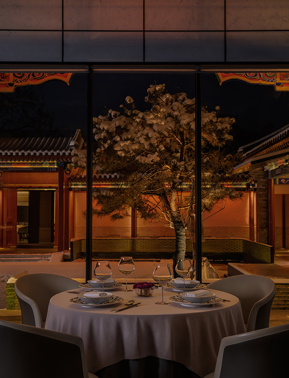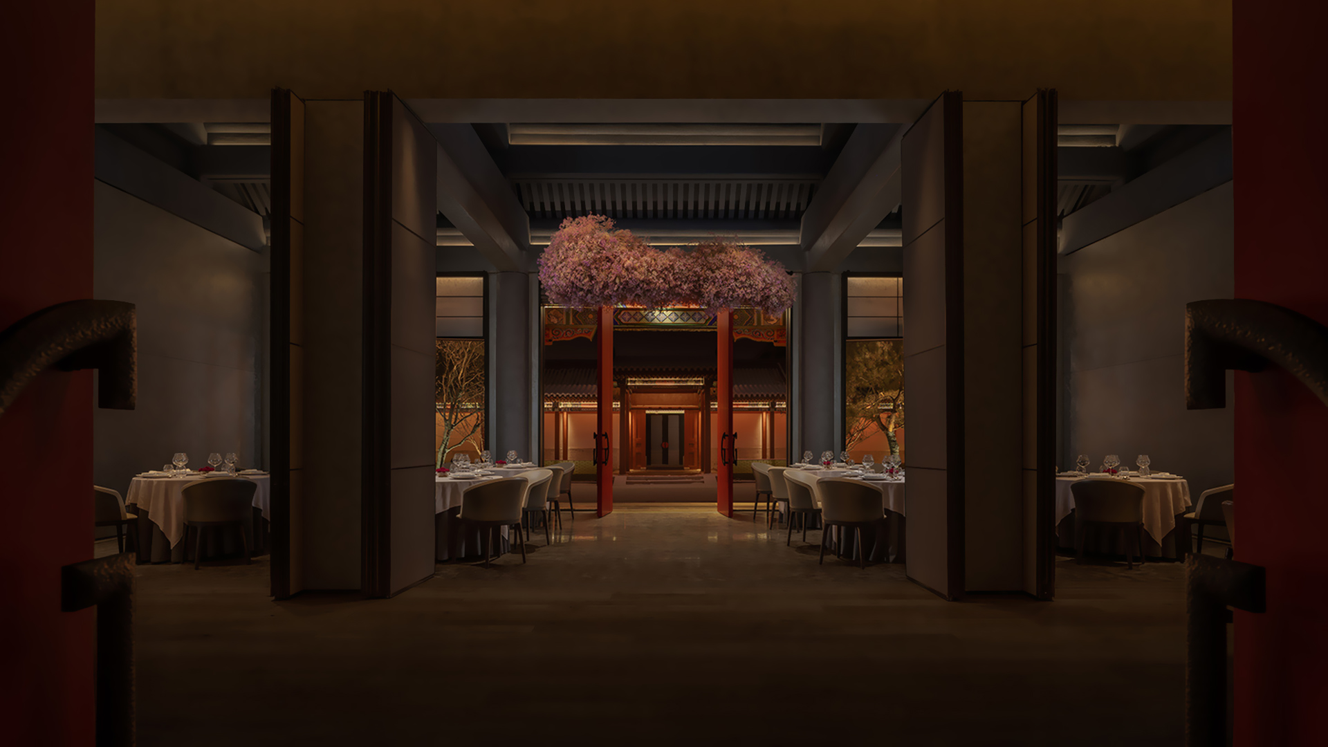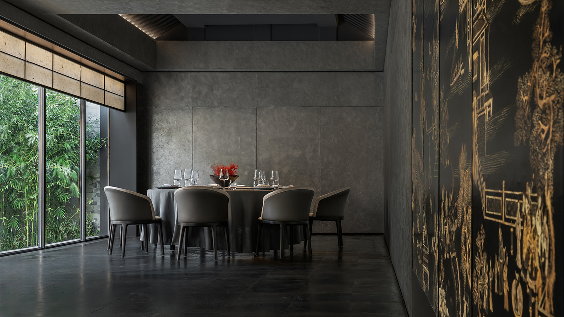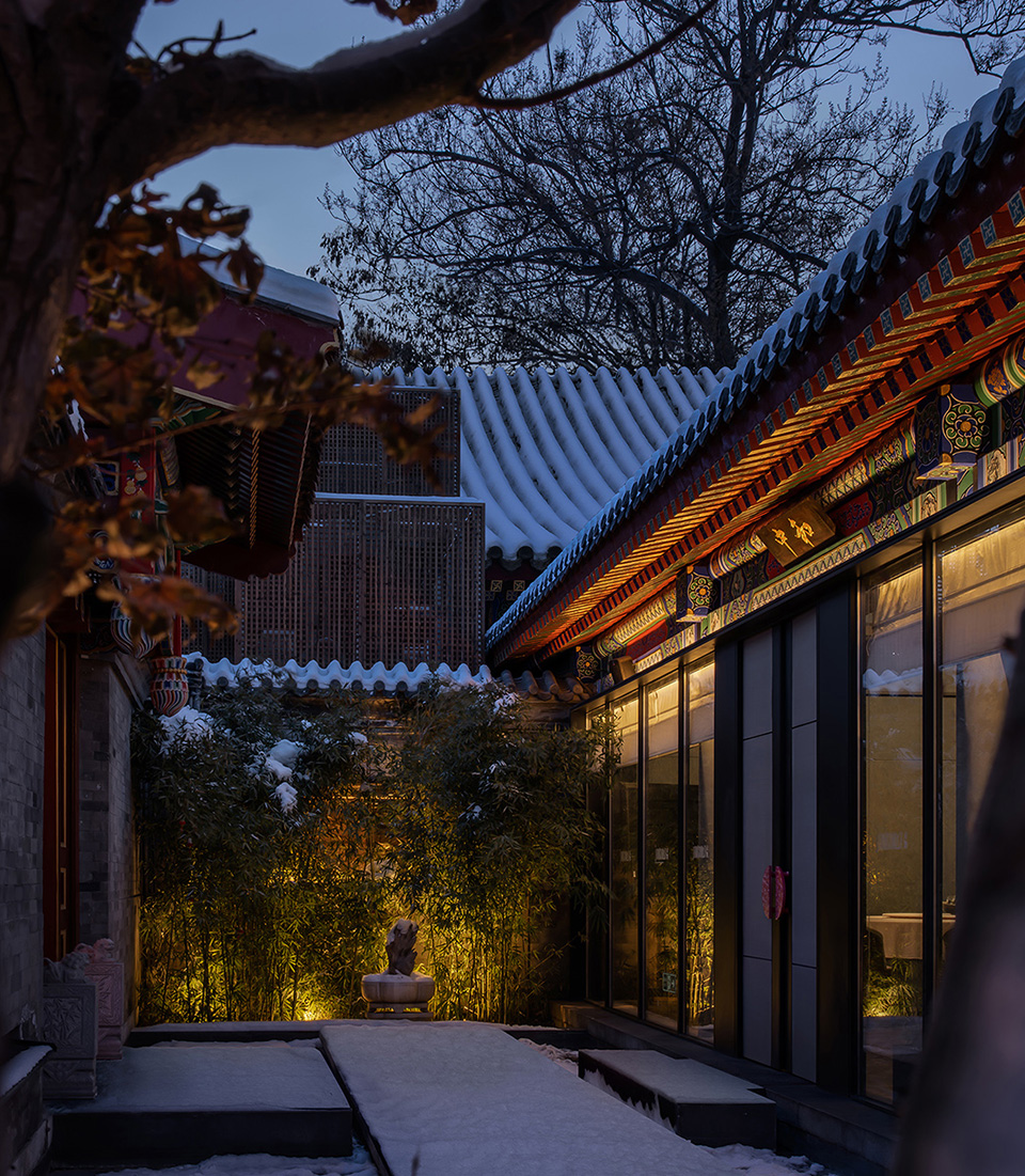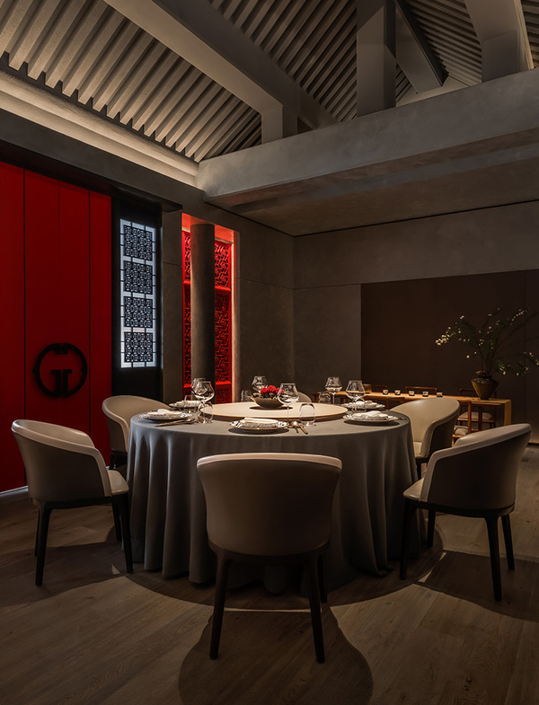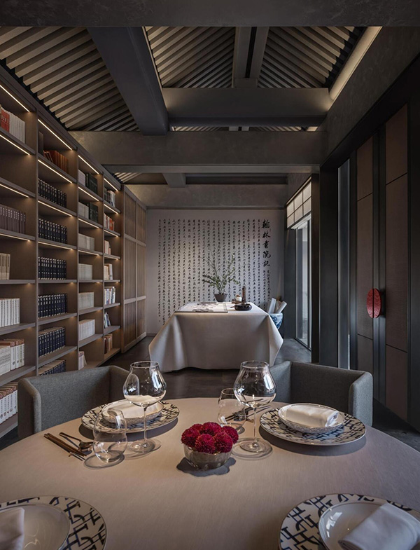 京艷内院两侧的厢房分别设有书房和茶室,保留了古意盎然的漆画、碑帖,以及记录这座院落始建境况的“翰林书院赋”。 联排通高书架在隐藏灯的映衬下,与山形屋顶的内在结构形成错落有致的秩序节奏。灰色解构墙面与中古家具围合出低调而温馨的交谈氛围。 书院既成,儒素可风。京艷通过简化而接近设计本质。以沉静端雅为纲,以现代设计为法,释放这座中式庭院闹中取静、闲适淡泊的天性。 这是对自然餐饮模式的探索,是餐饮、自然与生活场景的充分融合。“我们试图在未知领域的探索建筑的意境,”京艷以建筑语言构筑细腻的新京菜体验,“融合开放的认知精神,采用建筑的解构塑造本体,宁静而雅致。” 春临月台赏桐花,夏匿竹荫饮茶凉,秋剥蟹鳌红脂美,冬围暖炉联梅诗。这座现代的四合院承继古典秩序与时代新知的微妙平衡,人物情景交迭递变,满载京味生活样态。
