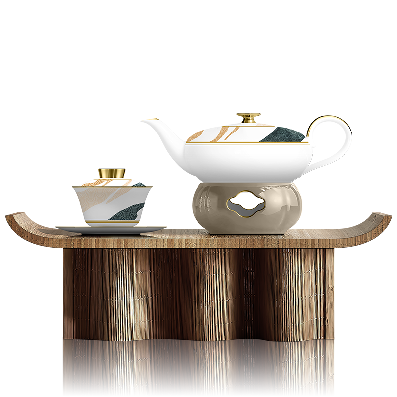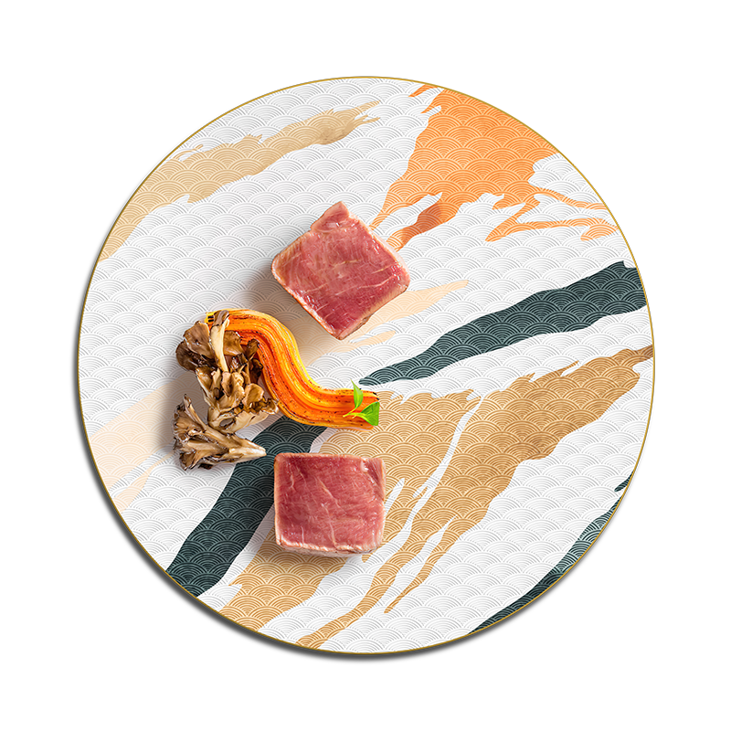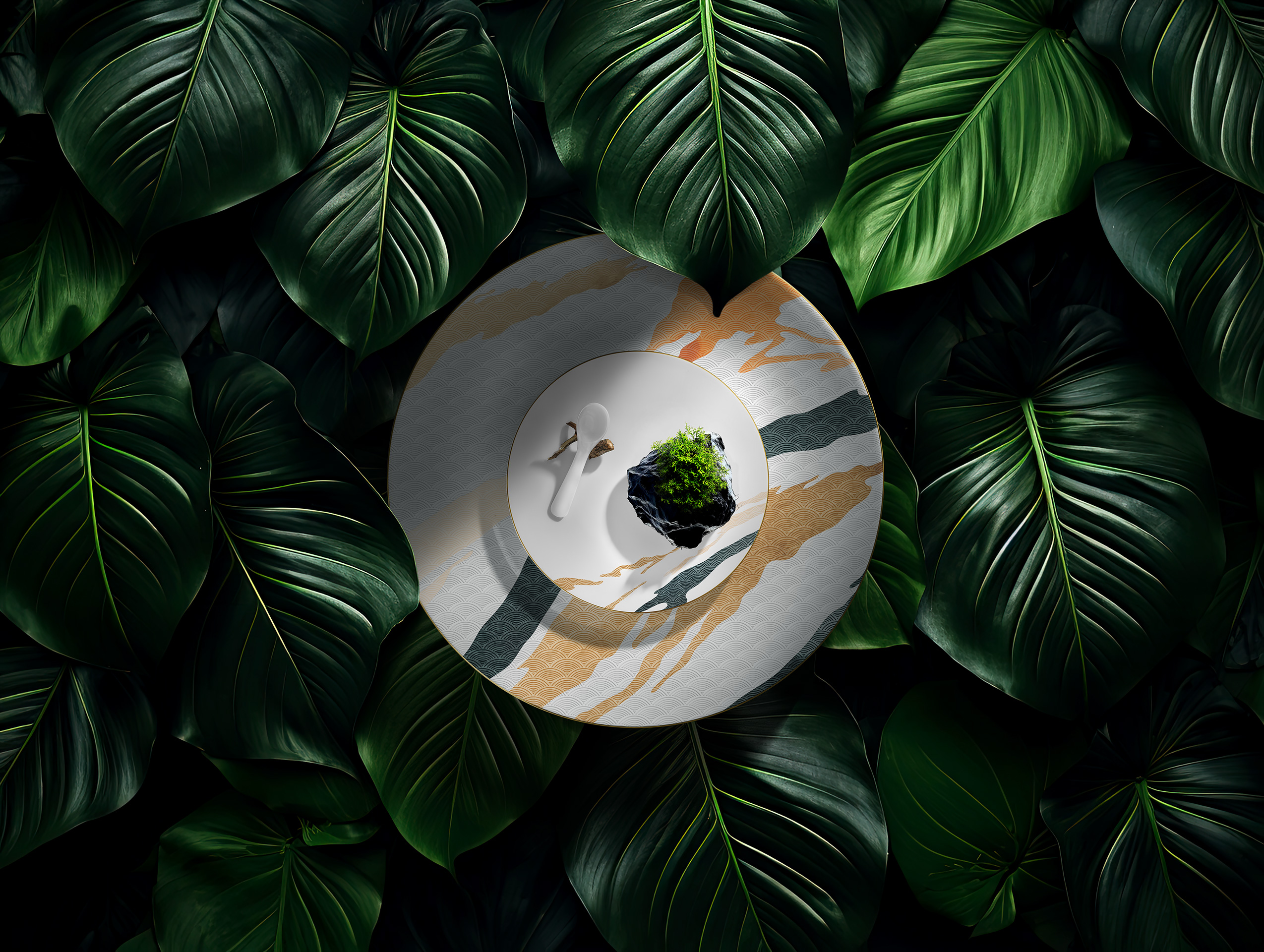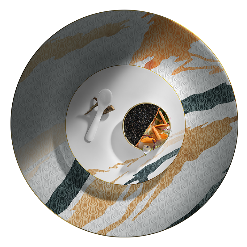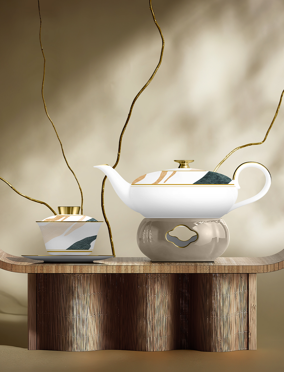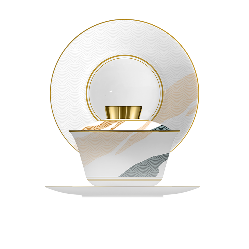 设计以巍峨雪山的灵韵为笔,勾勒出金顶与晨光共舞的抽象诗篇。这一系列餐具将雪山的孤傲与朝阳的温柔凝于器皿之上——纯白釉面如新雪初霁,金色线条似破晓光芒穿透山脊,深绿与棕褐的笔触则化作苍松与岩层的暗影,每一道纹路都是自然的呼吸。