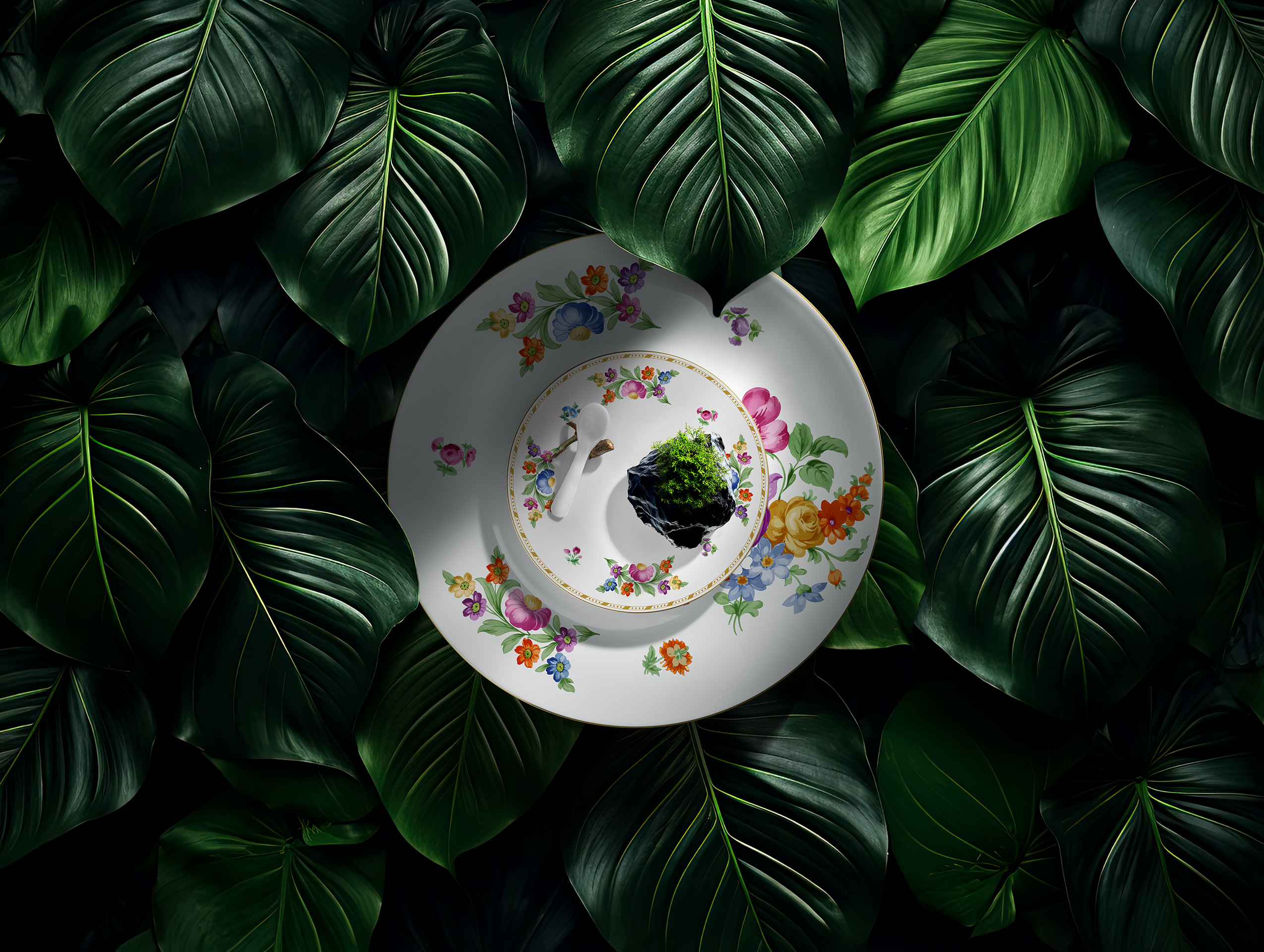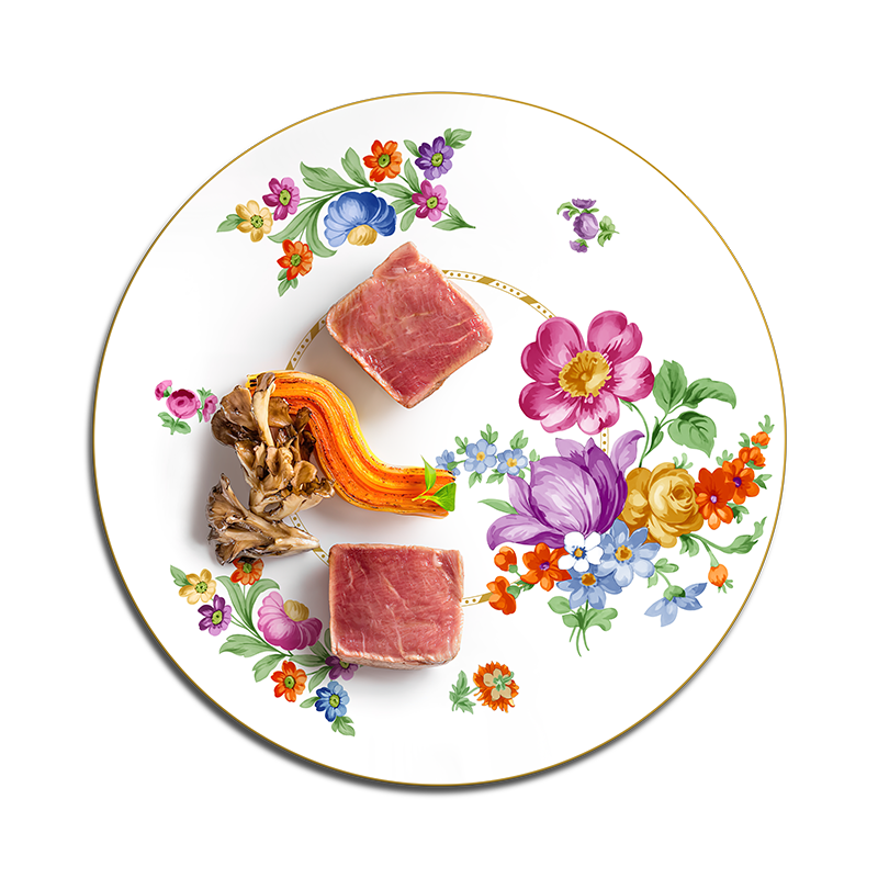 SKETCH 这款作品以纯白瓷面为田园画布,描绘出一幅绚烂的英式花园景象。素白底色如晨光薄雾,为缤纷花卉提供宁静的背景。玫瑰以饱满的玫红色绽放,花瓣层叠如丝绒;雏菊点缀其间,纯白与亮黄的交织清新灵动;绣球花簇以蓝紫渐变晕染,仿佛沾着朝露。叶片以不同层次的绿意铺陈,从橄榄绿到翠绿的过渡自然柔和,呈现植物在光线下的真实质感。