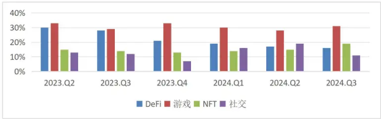 截至2024年10月,全球Web3.0产业总融资超过910亿美元,虽然与2021-2022年的高峰相比有所回落,但产业正回归理性发展。2024年第三季度数据显示: